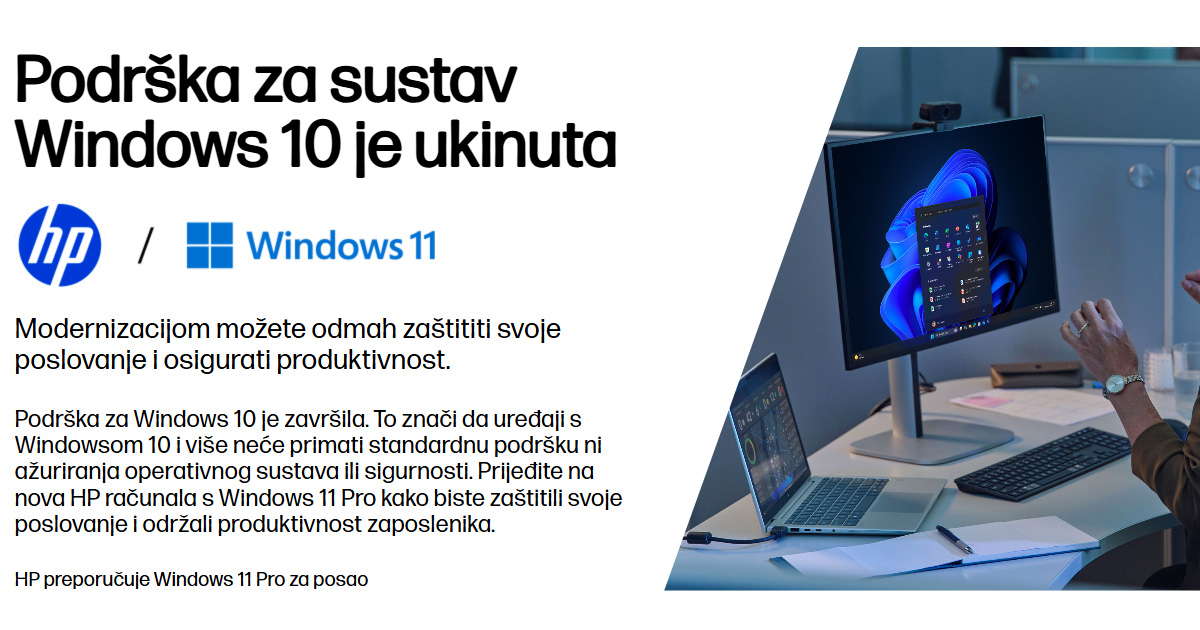 Podrška za Windows 10 je završila. To znači da uređaji s Windowsom 10 i više neće primati standardnu podršku ni ažuriranja operativnog sustava ili sigurnosti. Prijeđite na nova HP računala s Windows 11 Pro kako biste zaštitili svoje poslovanje i održali produktivnost zaposlenika.